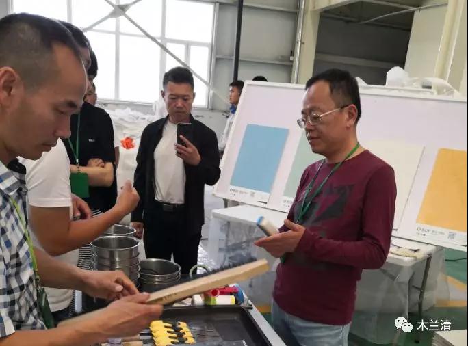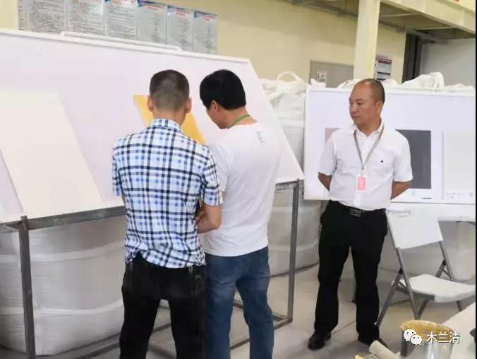 ▲木蘭清技術部部長陳志強為浙江沸石壁材經銷商考察團進行施工培訓
