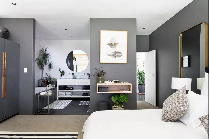 不過灰色要刷得高級并不容易,這很講究整體氛圍的色調搭配,不然容易顯得壓抑,通常灰色墻面會搭配一些比較活躍的軟裝。所以用灰色墻面的臥室,可以在床單、窗簾等軟飾采用比較活潑的色調。