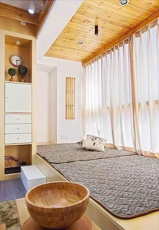 家中的陽臺被設計成了日式榻榻米,架高的地臺上鋪著舒適的軟墊,木質吊頂與風格相適應,輕柔的透光窗簾隨風舞動,甚是唯美。