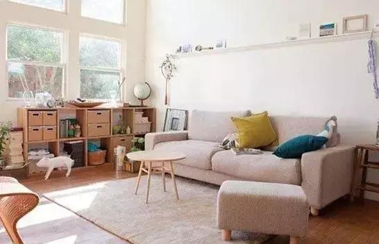 一張沙發,一塊地毯,一只茶桌,一組收納柜,組成了這個簡單實用的客廳空間,墻上的一塊擱板用來展示相片,顯露出簡單純粹之美。