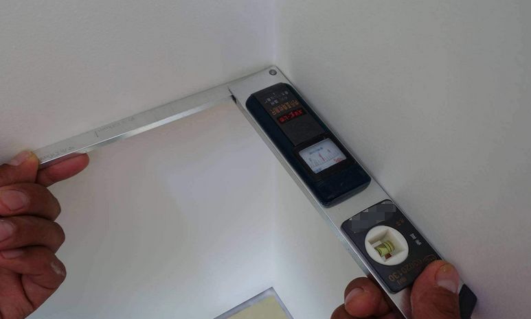 測陰角是否方正:直角檢測尺的直角放進墻角凹槽,保證水平儀平穩,查看陰角是否方正。