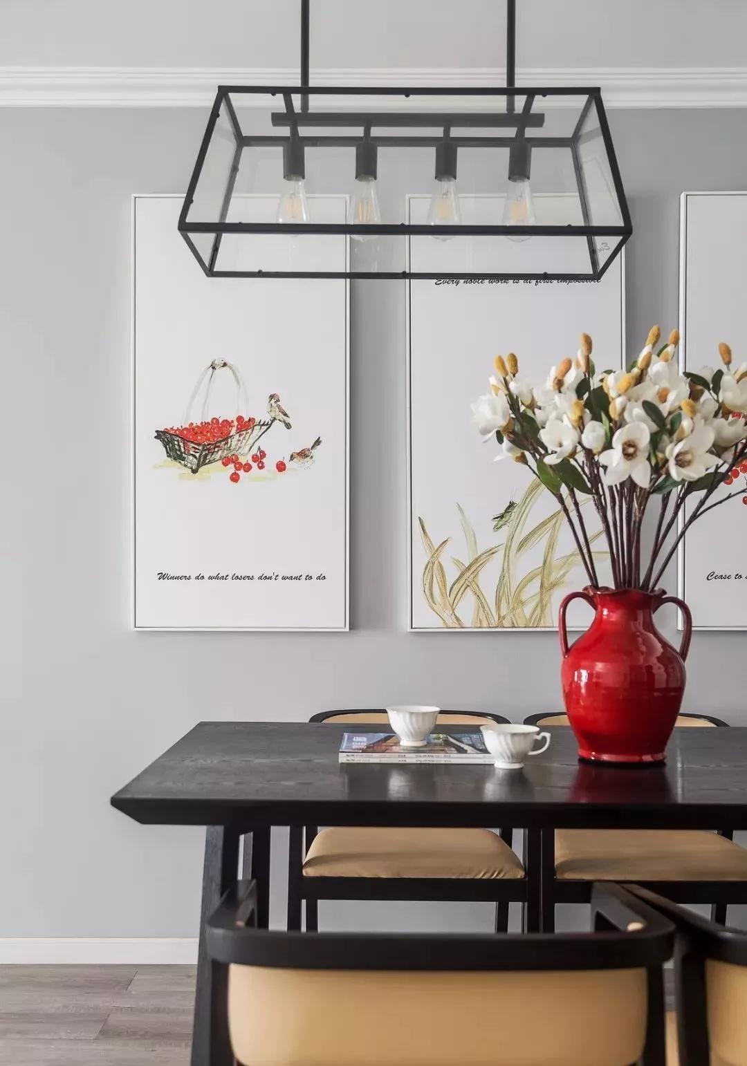 吊燈選用復(fù)古式的造型,紅色的花瓶顏色濃郁鮮艷,卡其色的皮質(zhì)餐椅,顯得很有質(zhì)感。