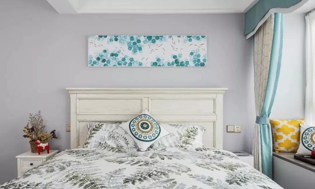 臥室沸石墻面繼續(xù)延用客廳高級灰色調(diào),淺藍(lán)和白色相間配飾,十分清新舒適。