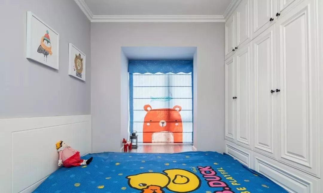 兒童房的墻面雖然采用素色藍(lán)灰色沸石墻面,但是搭配卡通掛畫和窗簾更顯童趣。