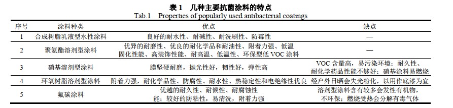 根據 GB/T2705-2003《涂料產品的分類、命名和型號》,以涂料產品的用途為主線,并輔以主要成膜物的分類方法,將涂料產品可劃分為三個主要類別:建筑涂料、工業涂料和通用涂料及輔助材料。建筑涂料主要包括墻面涂料、防水涂料、地坪涂料和功能性建筑涂料;工業涂料主要包括汽車涂料、木器涂料、鐵路公路涂料、輕工涂料、船舶涂料、防腐涂料和其他專用涂料。按照涂料用途來分,根據 GB/T 21866-2008,抗菌涂料主要是建筑用抗菌涂料和木器用抗菌涂料。按照涂料合成抗菌涂料分水性抗菌涂料和溶劑型抗菌涂料,主要品種有合成樹脂乳液型水性涂料、聚氨酯溶劑型涂料、硝基溶劑型涂料、環氧樹脂溶劑型涂料、氟碳涂料等。最新的還有一類負離子抗菌涂料,將負離子添加到涂料的顏料晶體中,產生大量的負離子,達到消毒和滅菌的目的。各類抗菌涂料主要特點見表1。