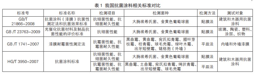 我國抗菌涂料檢測國家標準有《抗菌涂料(漆膜)抗菌性測定法和抗菌效果標準》(GB/T21866-2008)、《光催化抗菌材料及制品抗菌性能的評價標準》(GB/T23763-2009) 、《漆膜耐霉菌性測定法》(GB/T1741-2007)等,行業標準有《抗菌涂料標準》(HG/T3950-2007) ,具體要點如下表1所示。這些標準為我國抗菌涂料抗細菌和抗霉菌性能的定性定量檢驗,以及抗菌涂料行業的規范發展起到了推動作用。