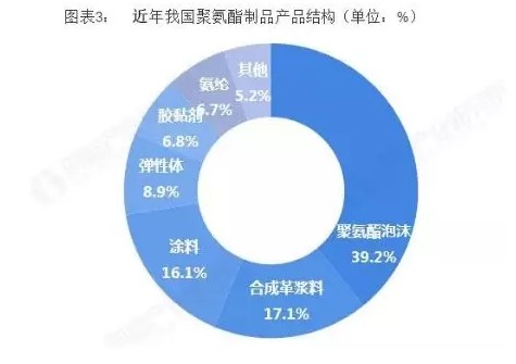 從聚氨酯應用來看,我國目前聚氨酯的主要應用領域是聚氨酯泡沫(包括硬質、軟質等)、革用聚氨酯、涂料和彈性體等。近年來,我國聚氨酯制品消費最多的是聚氨酯泡沫、合成革漿料和涂料,分別占39.2%、17.1%、和16.1%;其他制品所占比重均在10%以下。