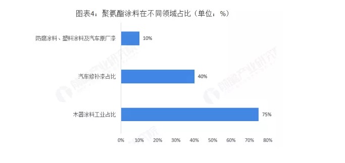 目前,聚氨酯涂料在木器涂料工業(yè)中占主導地位,占到75%的市場份額,緊接著是汽車修補漆,占40%多。此外,聚氨酯技術在防腐涂料、塑料涂料和汽車原廠漆方面的應用也越來越廣,占10%的市場份額。